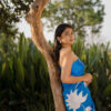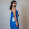 A deep blue saree adorned with a minimalist white leaf design. Inspired by the calming flow of the sea, this striking piece combines sophisticated colour contrasts and clean lines for a fashion-forward, contemporary look.